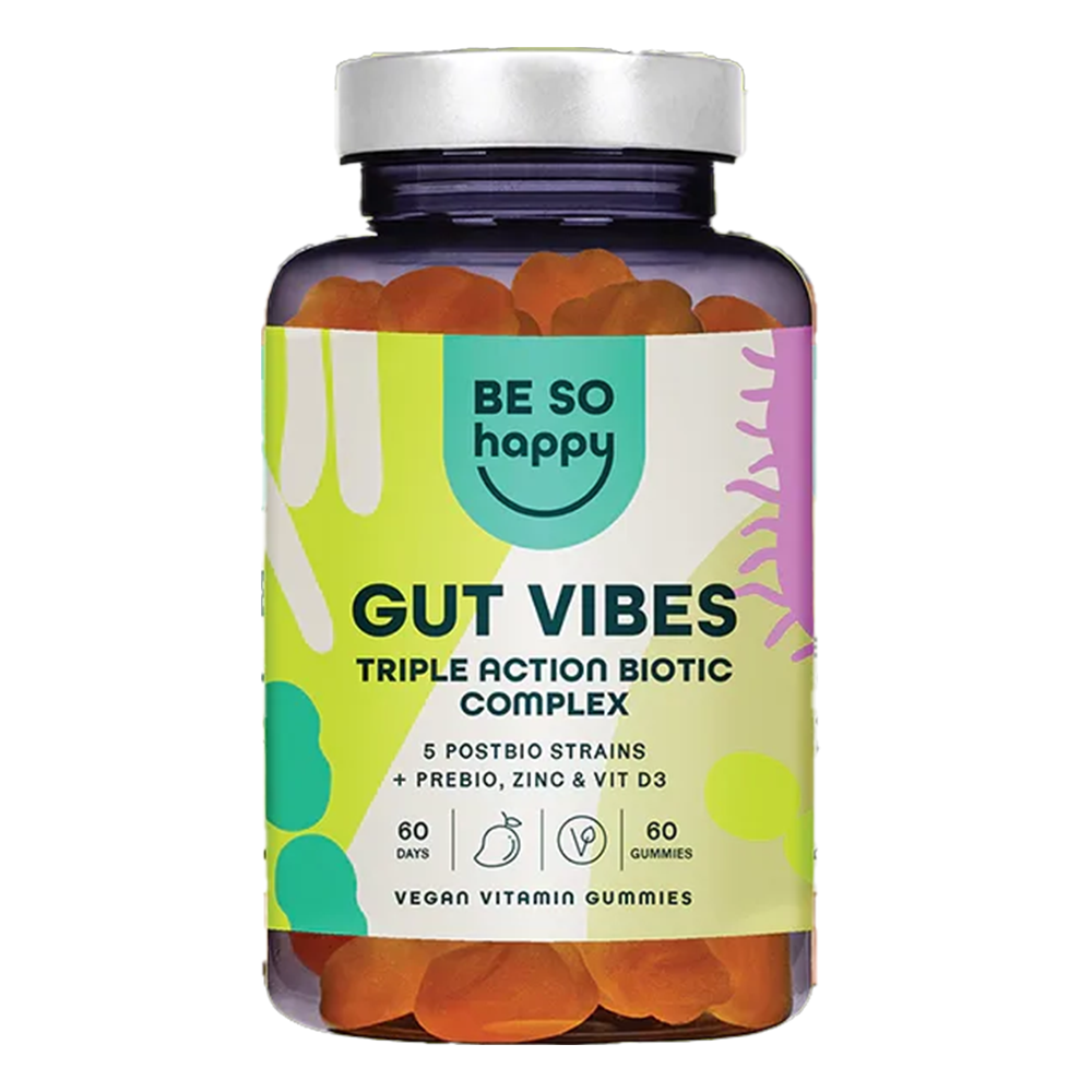 BE SO happy Gut Vibes tilbyr en brukervennlig tilnærming til tarmhelse med sin praktiske gummiform og behagelige smak. Kombinasjonen av 5 postbiotiske stammer, prebiotika, vitamin D3 og sink gir solid støtte til tarmfloraen og immunforsvaret, selv om den varmeinaktiverte naturen til bakteriestammene reiser spørsmål om optimal effektivitet.